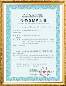2011年:GMP二期顆粒劑、液體消毒劑、滅菌大容量注射劑、口服溶液劑四條生產(chǎn)線,一次性以全優(yōu)成績順利通過國家農(nóng)業(yè)部專家組GMP驗(yàn)收;