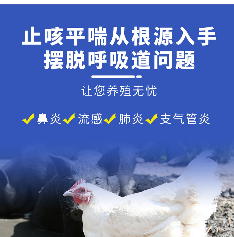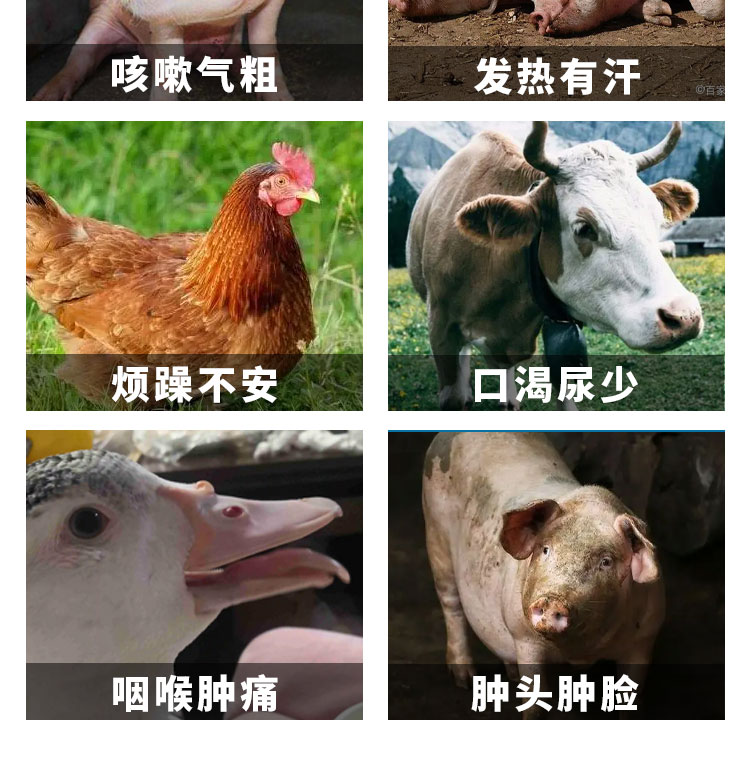 【癥狀表現(xiàn)】發(fā)熱有汗或無(wú)汗,煩躁不安,咳嗽氣粗,口渴尿少,舌紅,苔薄白或黃,脈象浮滑而數(shù)。對(duì)豬、雞因病毒、細(xì)菌、支原體感染引起的咳喘、粘液過(guò)多、支氣管栓塞等癥狀有特效。