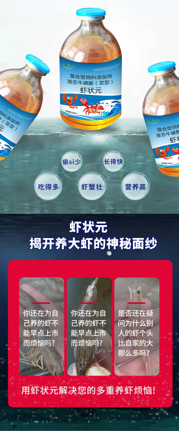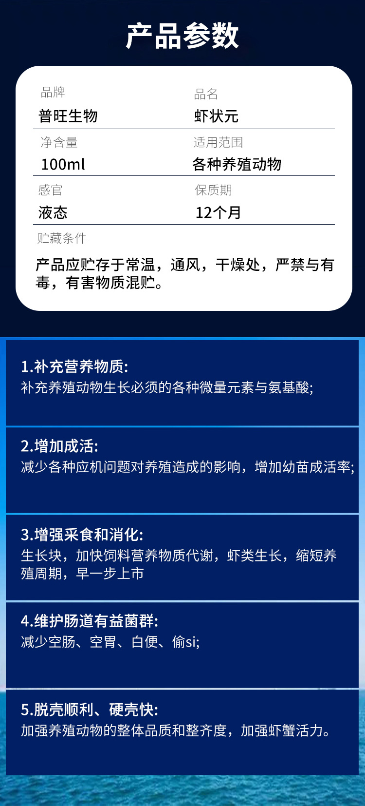 產(chǎn)品簡介:蝦狀元 吃的多長得快 營養(yǎng)高 偷死少 讓你養(yǎng)的蝦又肥又大 用蝦狀元解決你的多重養(yǎng)蝦煩惱。