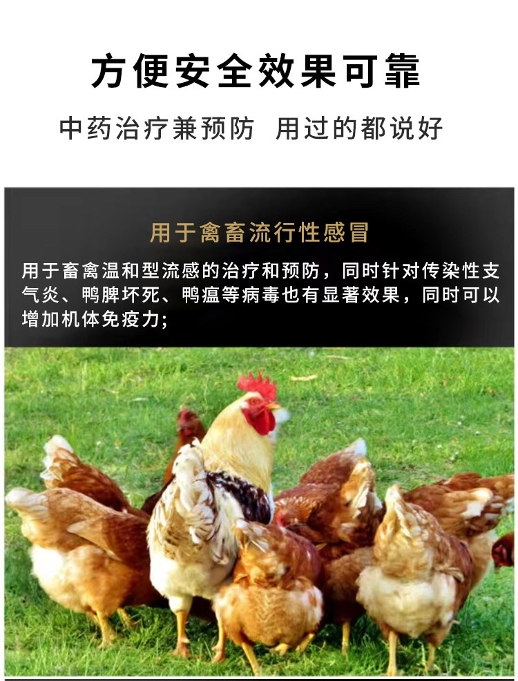 雞瘟、便秘、眼屎多、尿黃、流鼻涕、發(fā)呆感冒等,用于禽瘟和流感的治療與預防,同時針對傳染性支氣炎、鴨脾壞死、鴨瘟等病毒也有顯著效果,同時可以增強機體免疫力。" />